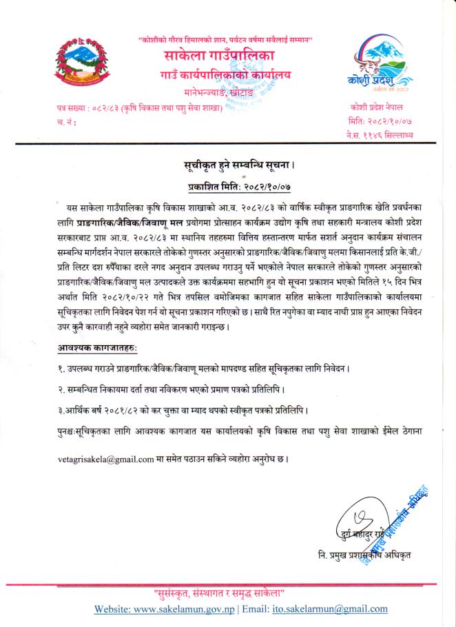 प्राङ्गरिक, जैविक र जिवाणु मल उत्पादकहरुले सूचिकृत हुने सम्बन्धी जरुरी सूचना
