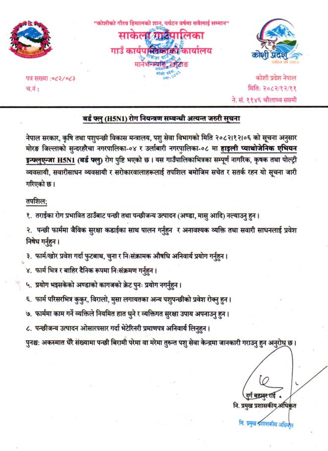 बर्ड फ्लु (H5N1) रोग नियन्त्रण सम्बन्धी अत्यन्त जरुरी सूचना