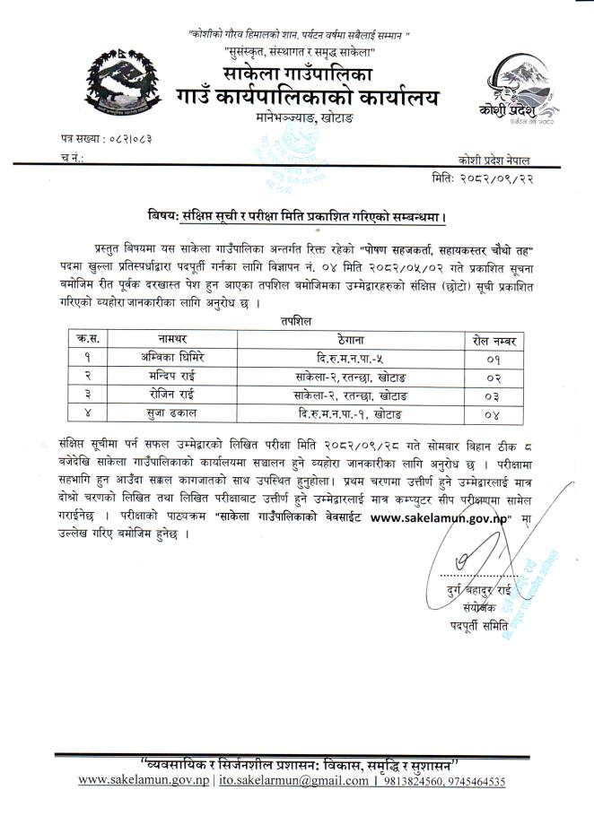 बहुक्षेत्रीय पोषण सहजकर्ताको संक्षिप्त सूची र परीक्षा मिति प्रकाशित गरिएको सम्बन्धमा