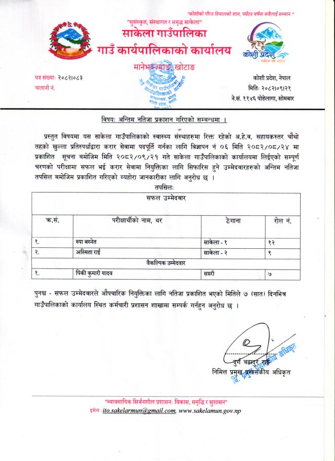 अन्तिम नतिजा प्रकाशित गरिएको सम्बन्धमा (सहायकस्तर चौथो अहेव)