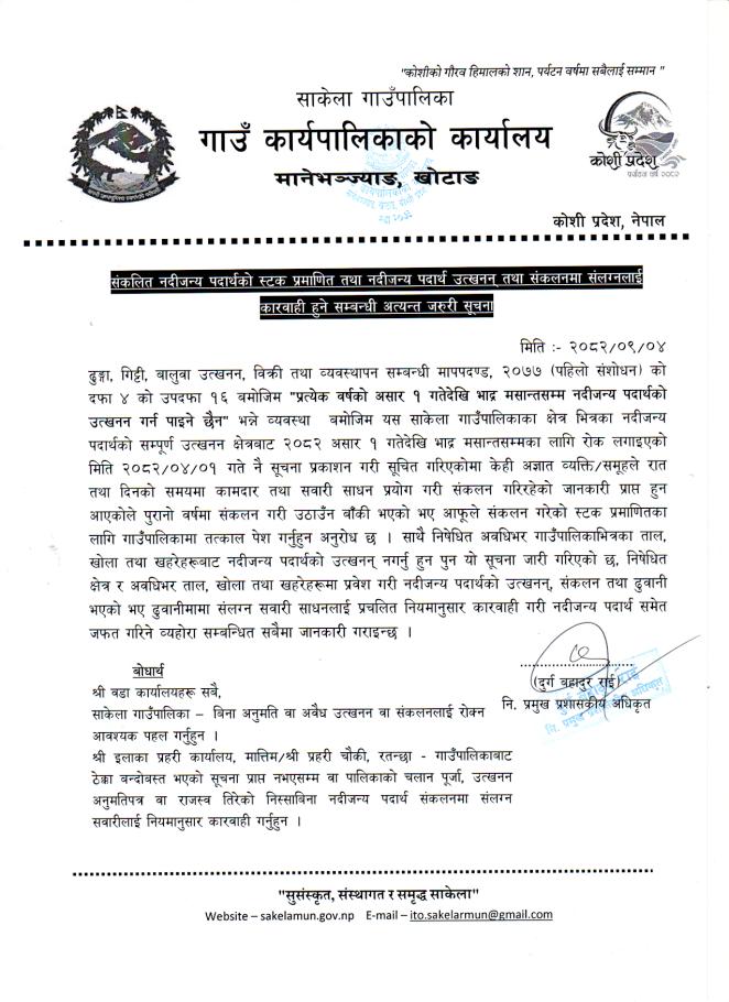 संकलित नदीजन्य पदार्थको स्टक प्रमाणित तथा नदीजन्य उत्खनन् तथा संकलनमा संलग्नलाई कारवाही हुने सम्बन्धी अत्यन्त जरुरी सूचना ।
